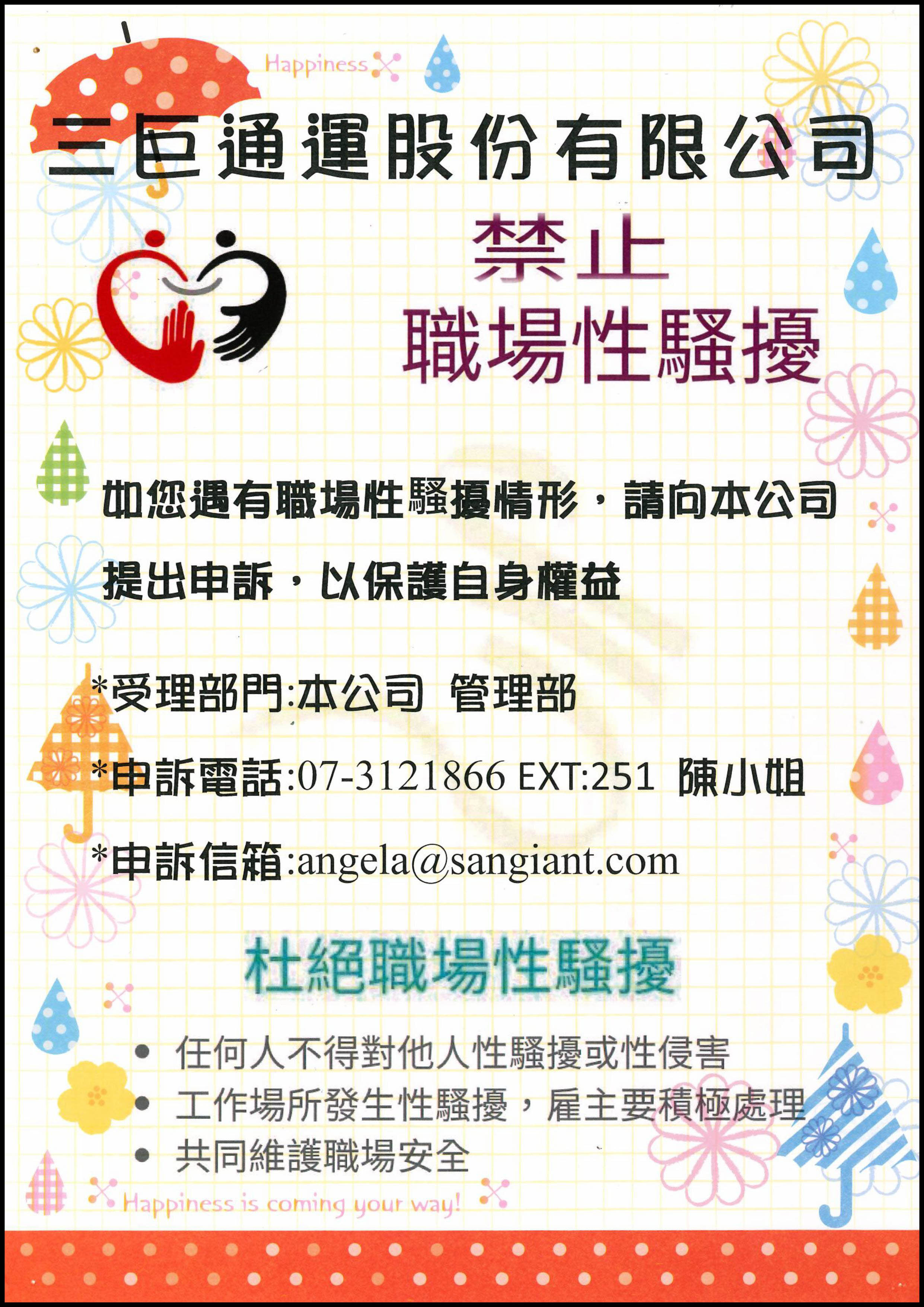 公司秉持 尊重、平等、友善 的原則,嚴禁任何形式的性騷擾行為。 若有相關不當言語、行為或事件發生,請勇於反映並透過申訴管道提出,我們將立即處理,並保障當事人權益與隱私。