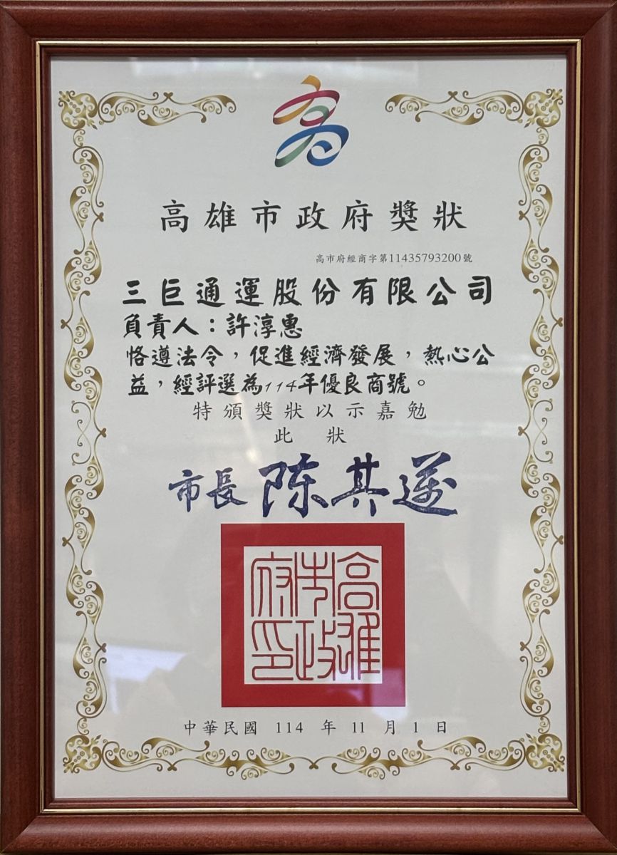 我們非常榮幸獲得 「優良商號」 的肯定。 這份榮耀象徵著對我們多年來在航運領域中,堅持專業、安全與效率的肯定。